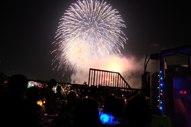 毎年この日は舟渡ワークスの屋上で「ヌースフィット花火大会」と称して、社員と親しいお客さまで観賞会を行なっています。今年も元タカラジェンヌ3名も駆けつけてくれました。初めての人は、すぐ近くで上がる花火の大きな音にびっくりします。